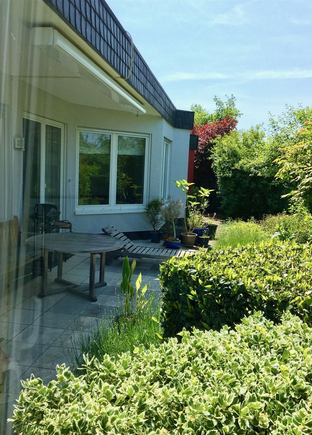 Die große, teilweise überdachte und zusätzlich mit einer Markise versehene Terrasse schmiegt sich an die gesamte Breite des Wohntrakts. Der Garten ist wunderbar bewachsen, nicht so groß und pflegeleicht.