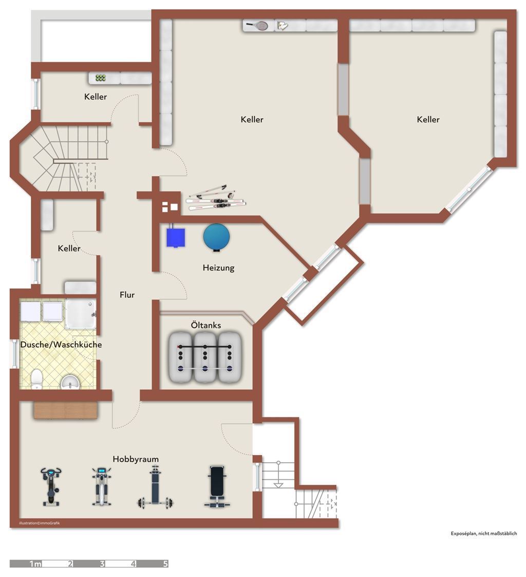 Die Kellerfläche entspricht der Erdgeschossfläche, ohne den Anbau und einen kleinen Teil unter der Küche. Hier gibt es also mehr als ausreichend Platz zur Entfaltung. Eine Beton-Kellertreppe führt hinaus in den Garten. -