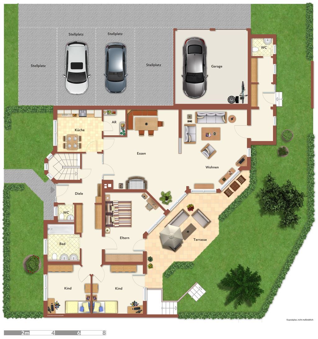 Im Erdgeschoß – das durch einen Eingang ins Wohnzimmer auch barrierefrei ist – gelangen Sie von der zentralen Diele zum einen in den separaten Schlaftrakt mit 3 Zimmern und einem Bad. Das große Schlafzimmer und ein Kinderzimmer öffnen sich über bodentiefe Fensterelemente ebenfalls zur Terrasse.