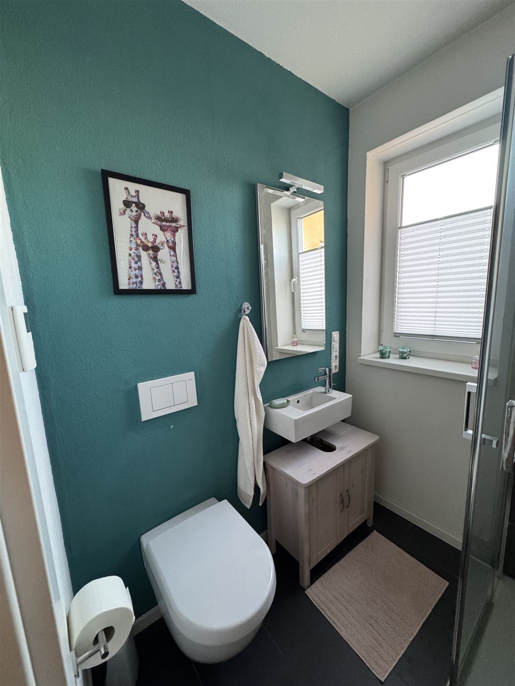 – ebenfalls ansprechendes Sanitär im Gäste-Bad (WC. Waschtisch, begehbare, verglaste Dusche).