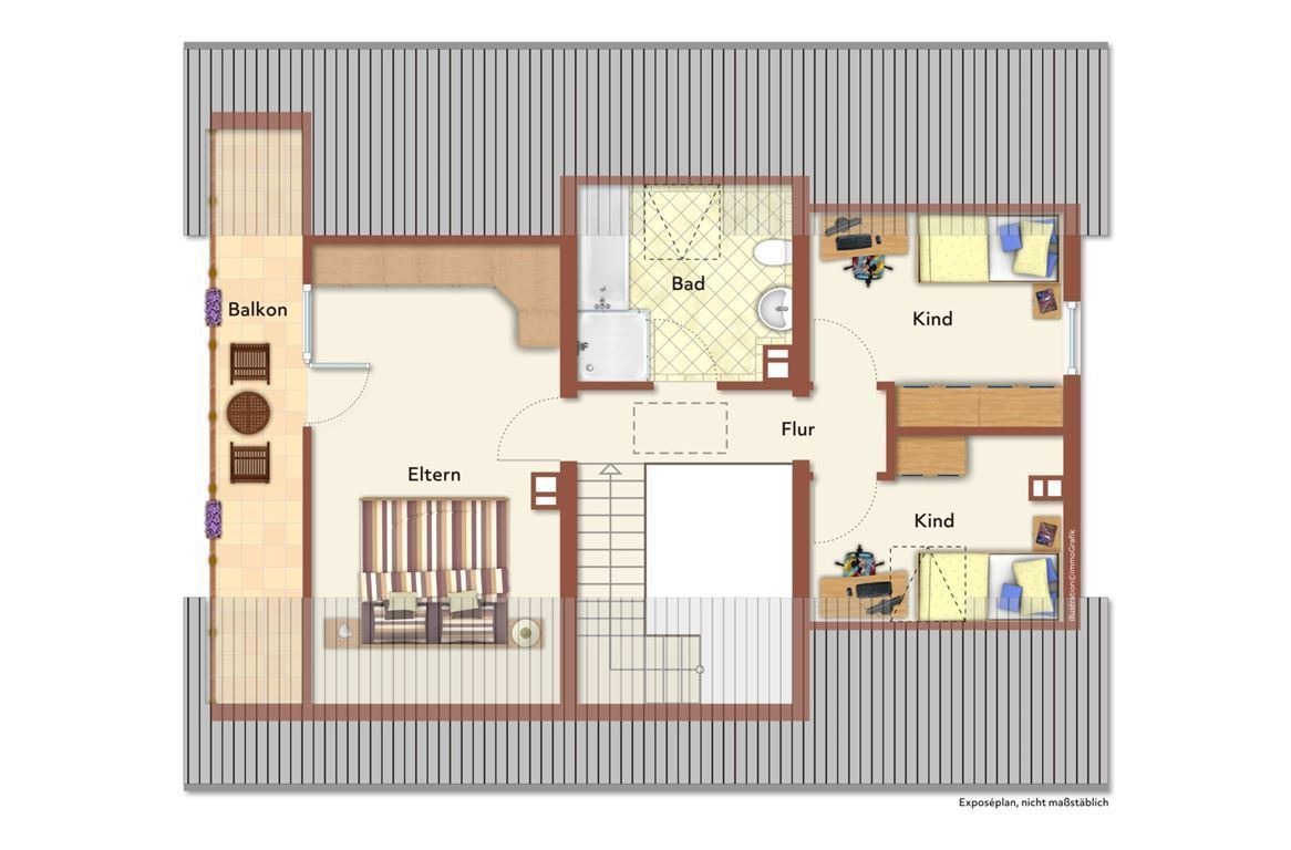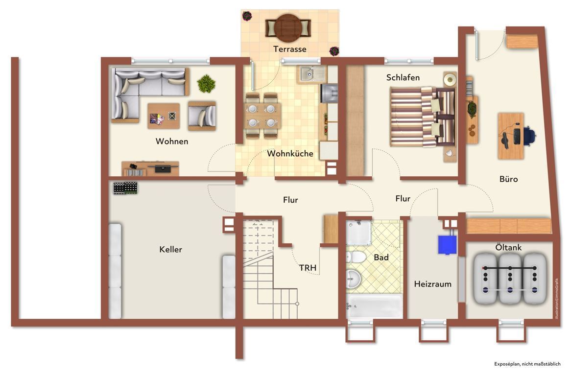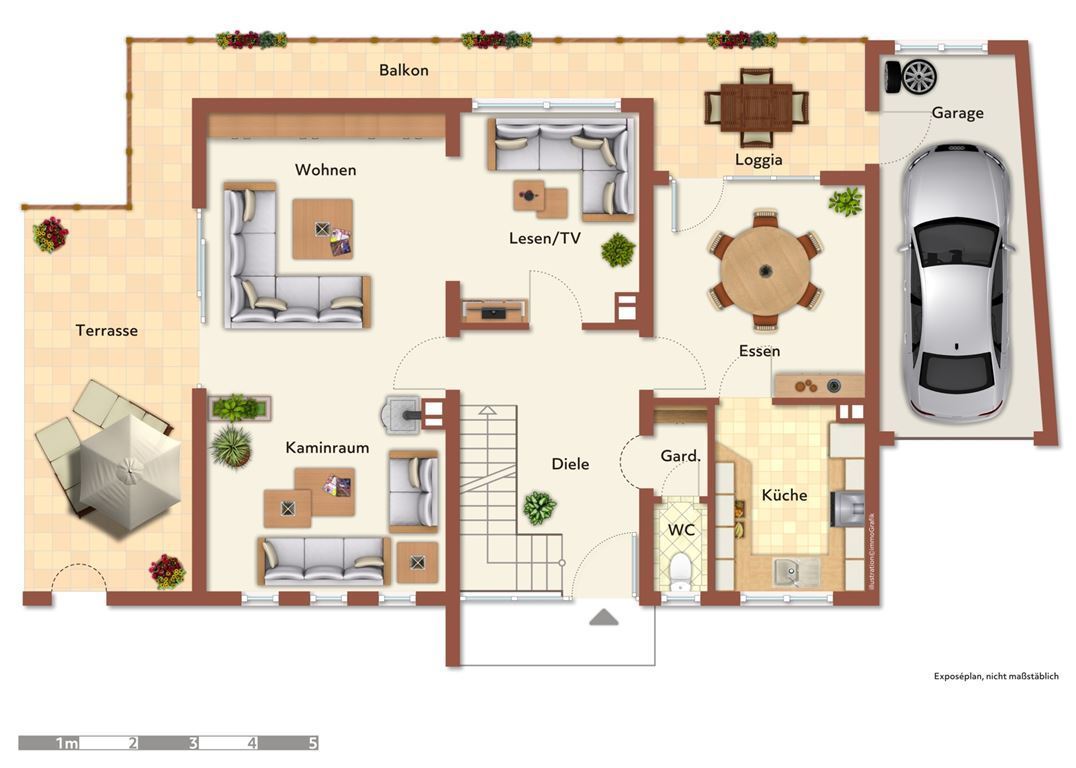 Die Küche ist separat, mit Durchgang zum Esszimmer. Von diesem Zimmer aus gelangen Sie auf eine Loggia und den teilumlaufenden Balkon. Es gibt von der Loggia aus auch einen direkten Zugang zur Garage. Diese wurde massiv erstellt und bietet mit 6,75 m Länge viele Platz für einen Pkw und die Fahrräder Ihrer Kinder.