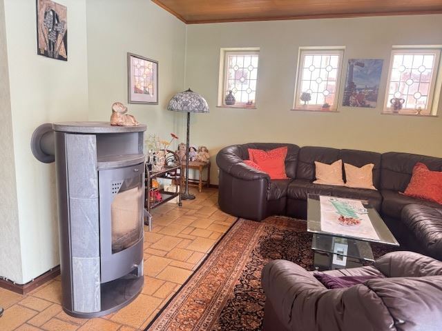 Über diese Diele gelangen Sie in einen sehr großzügigen Wohnbereich – incl. gemütlichem Kachelofen in einem Kaminzimmer. Dieser Bereich bietet Zugang zur Terrasse – durch ein großes Terrassentür-Element. Und – etwas abgeteilt befindet sich das Lese- und TV-Zimmer.